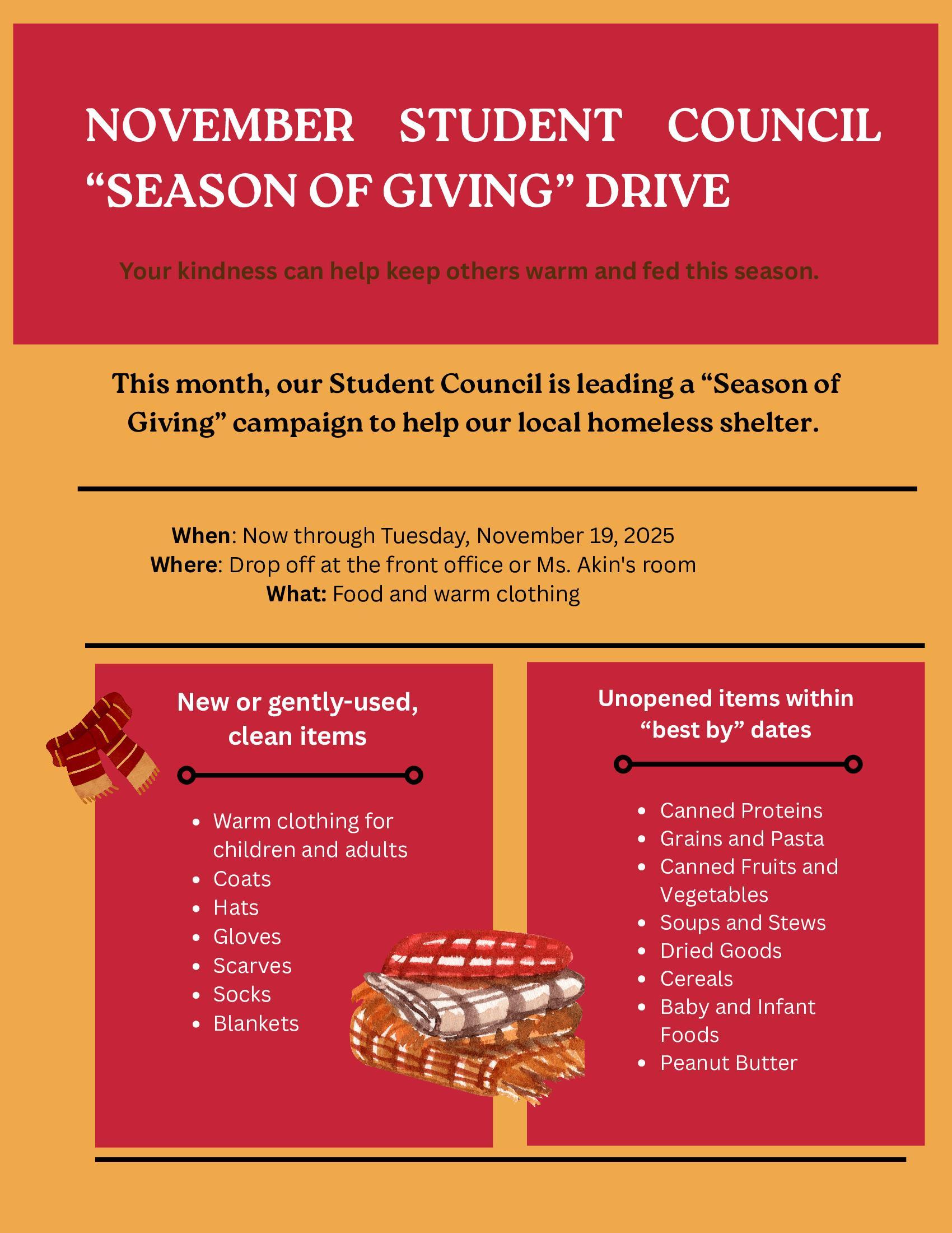 During November Student Council is leading a Kindness Drive. Donations can be dropped at the office or at Ms. Akin's classroom.