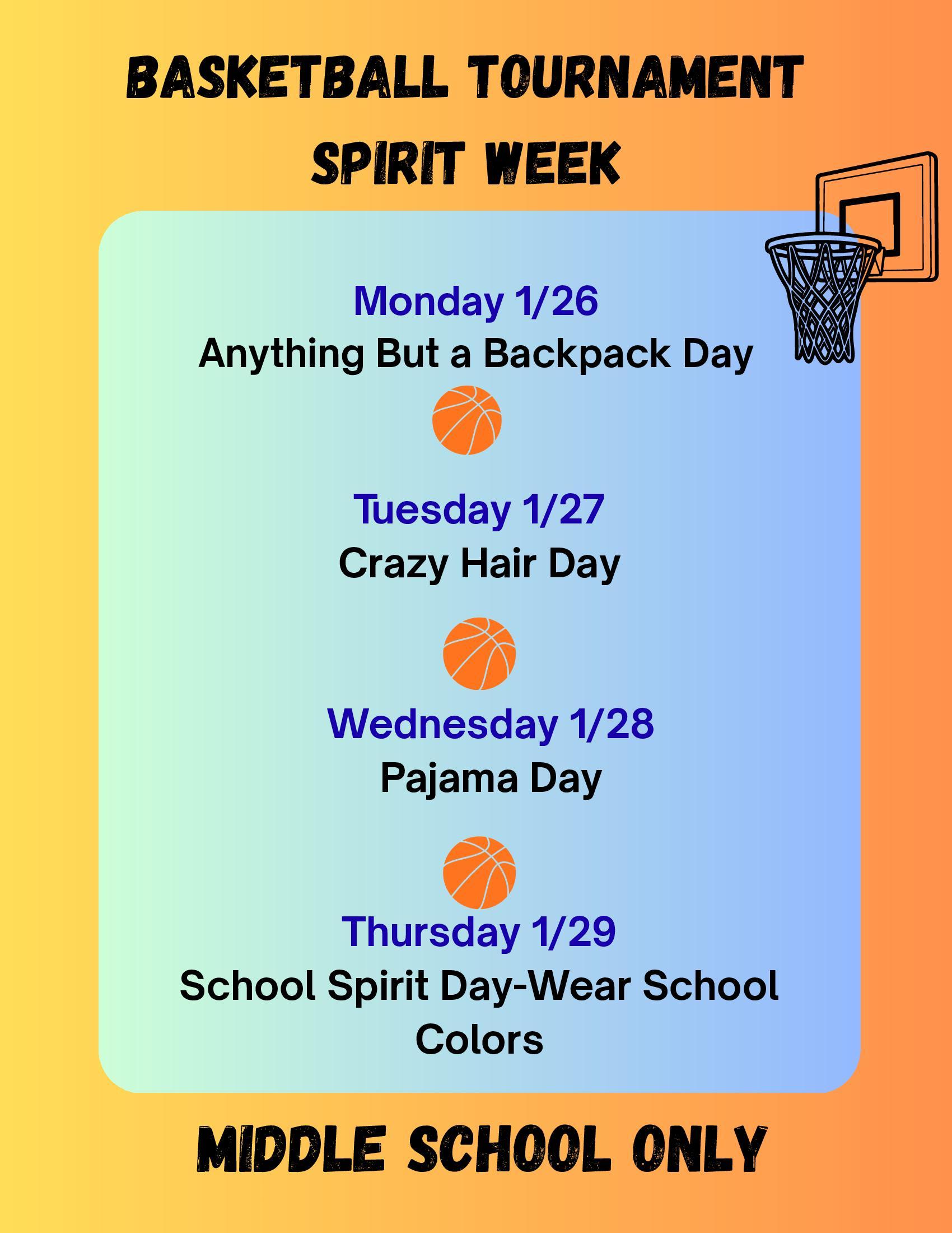 - The week of 1/26-1/29 is Middle School Spirit Week.