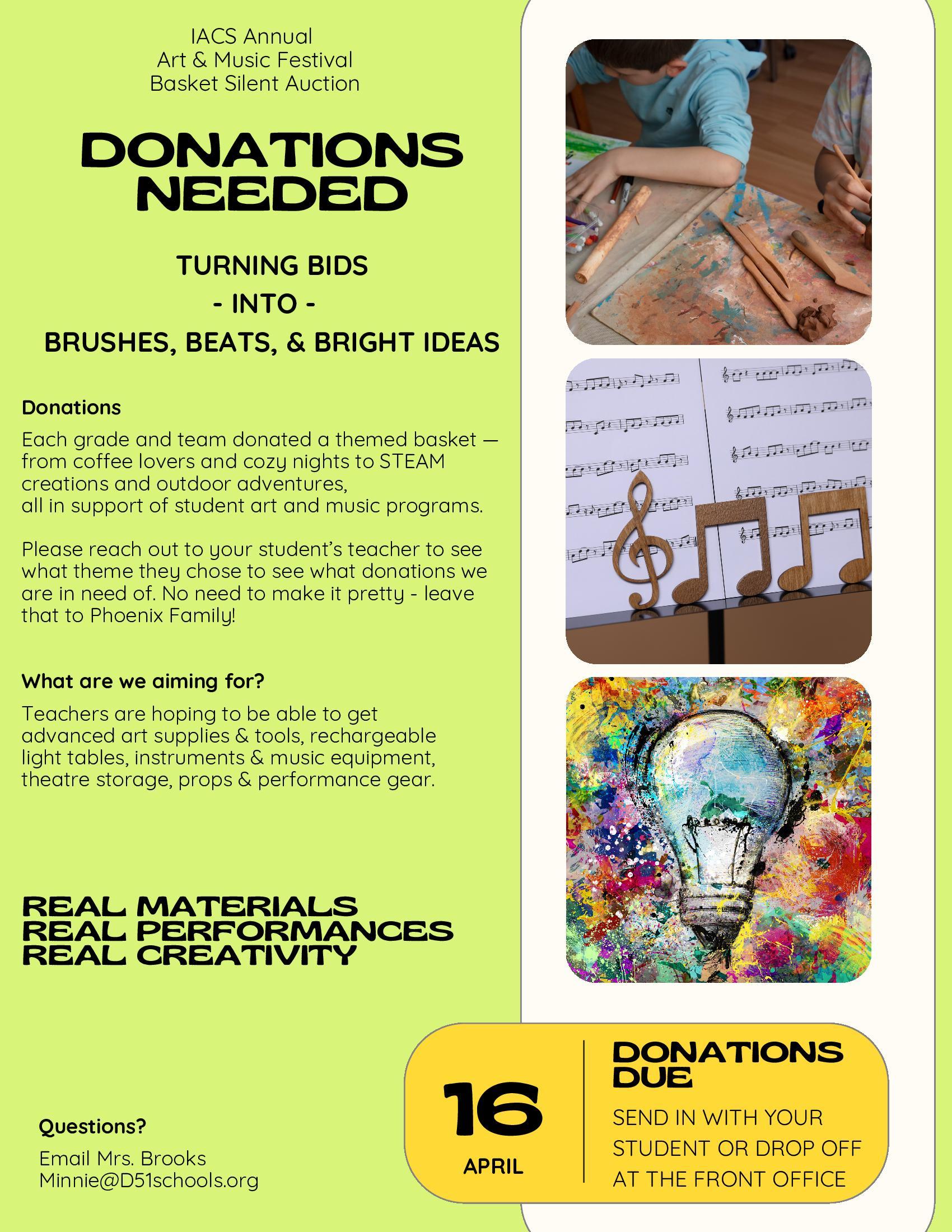- We are looking for donations for the auction baskets for the silent auction that occurs during the art and music show in May.