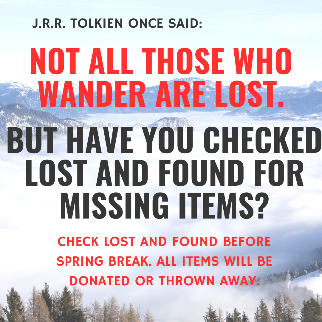 Check lost and found TODAY for missing items. All unclaimed items will be donated over spring break.