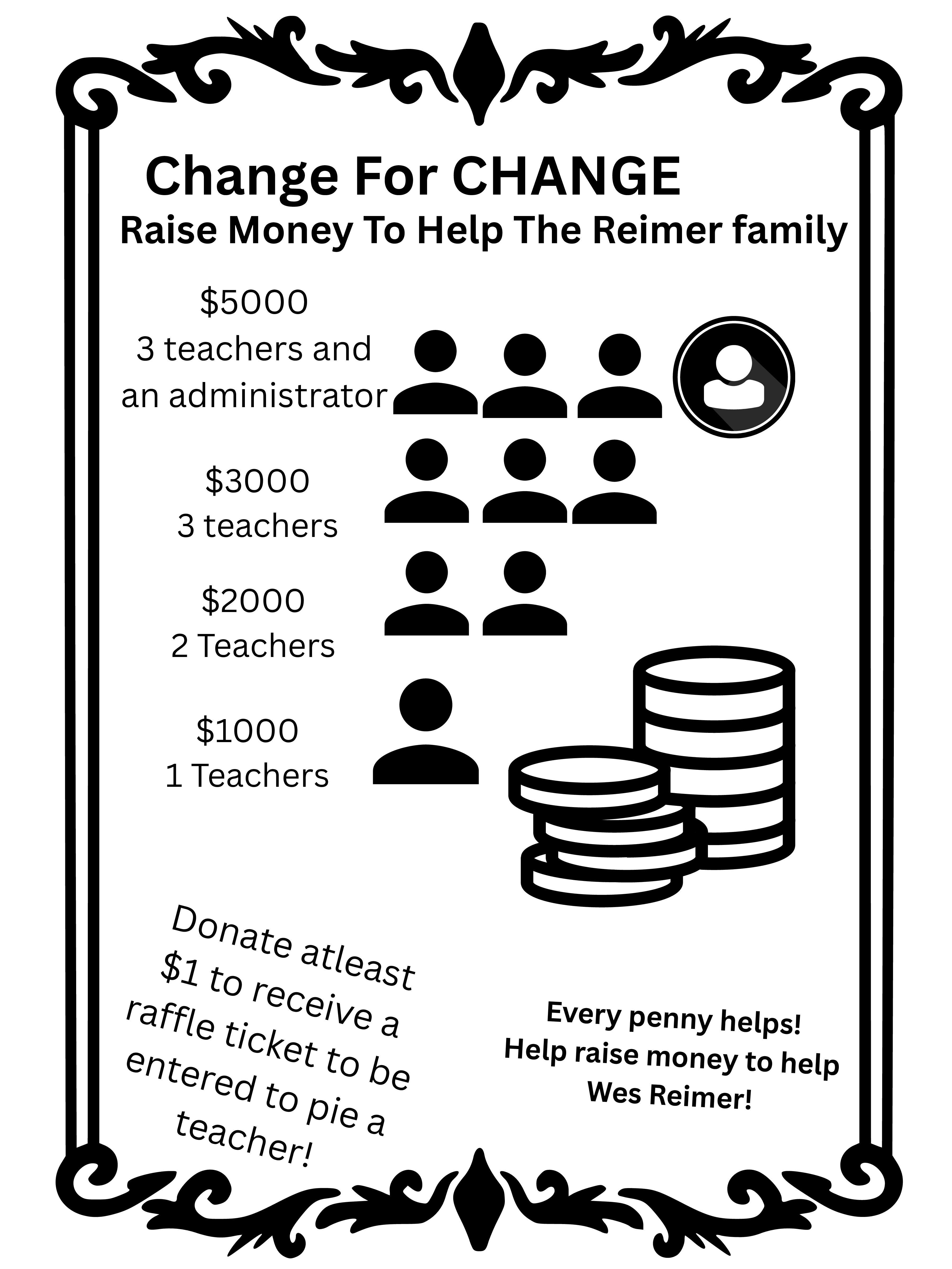 Collect your spare change over spring break to donate to the change for change drive. All proceeds will be donated to the Reimer family to help with expenses associated with Wes' hospital care. If enough is collected, we will get to see teachers and administrators get pied!